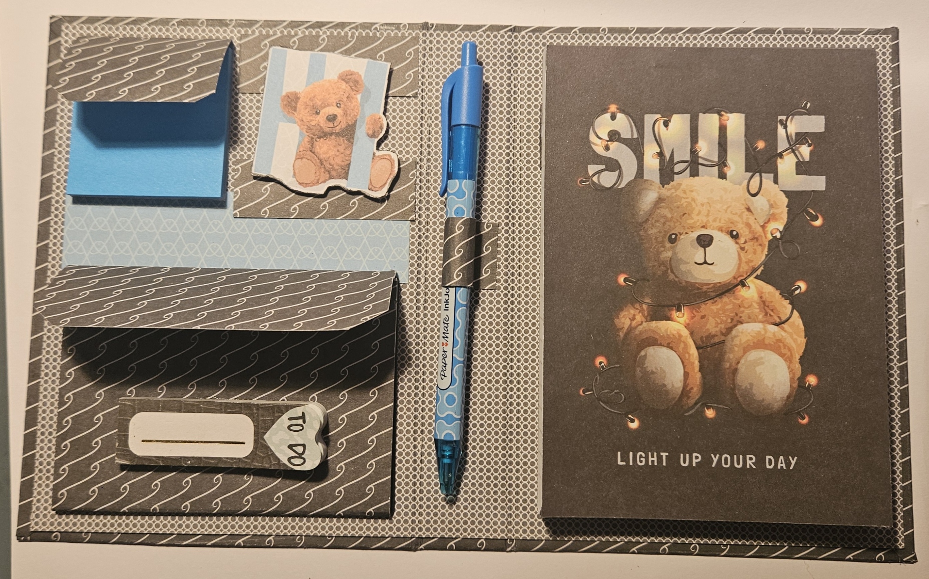 Carnet fait main, comprenant un calepin, des notes repositionables, une pochette à soufflets et un stylo assorti.